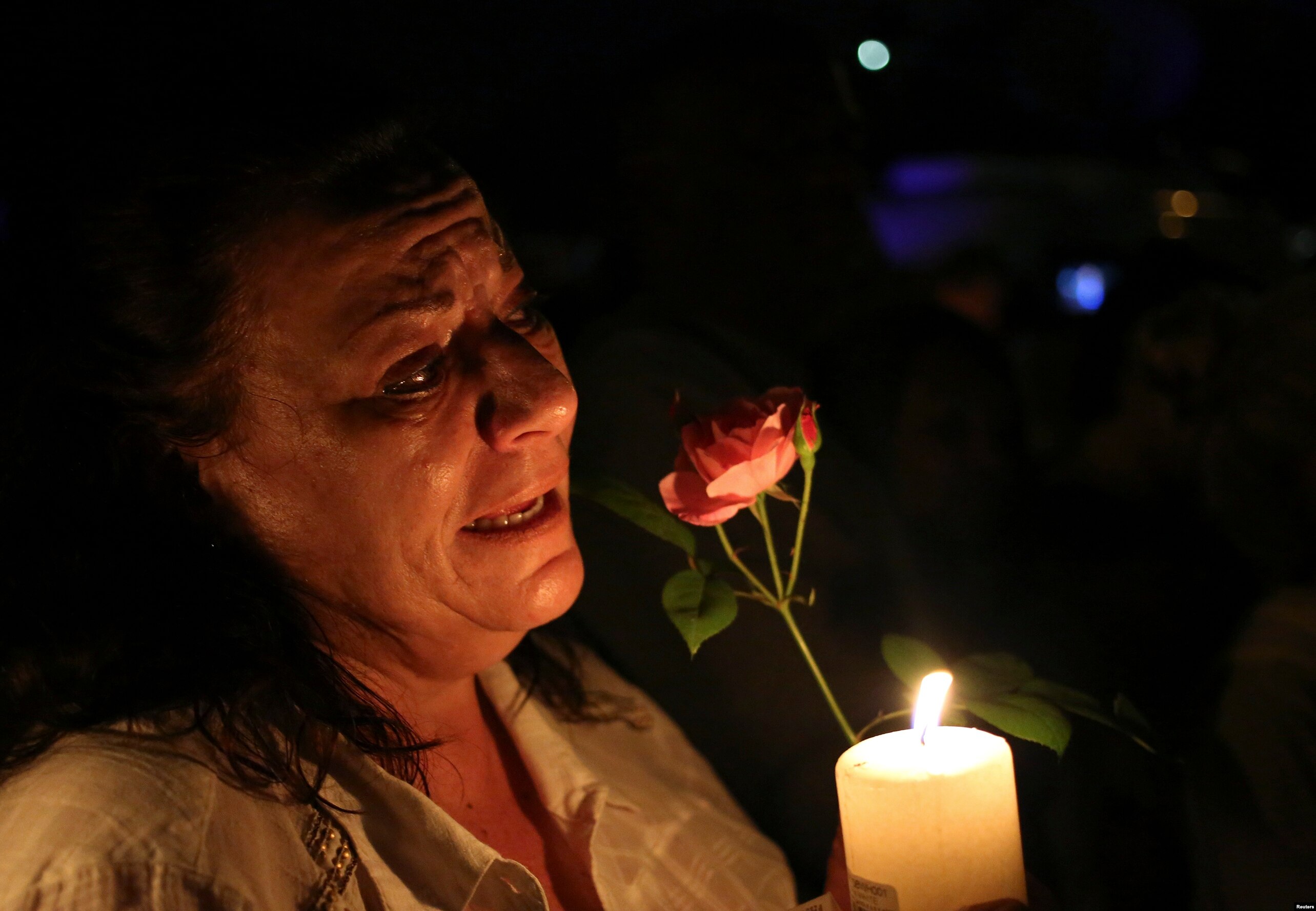A woman cries as she holds a candle and a flower outside former South African President Nelson Mandela's house in Houghton, Dec. 5, 2013a