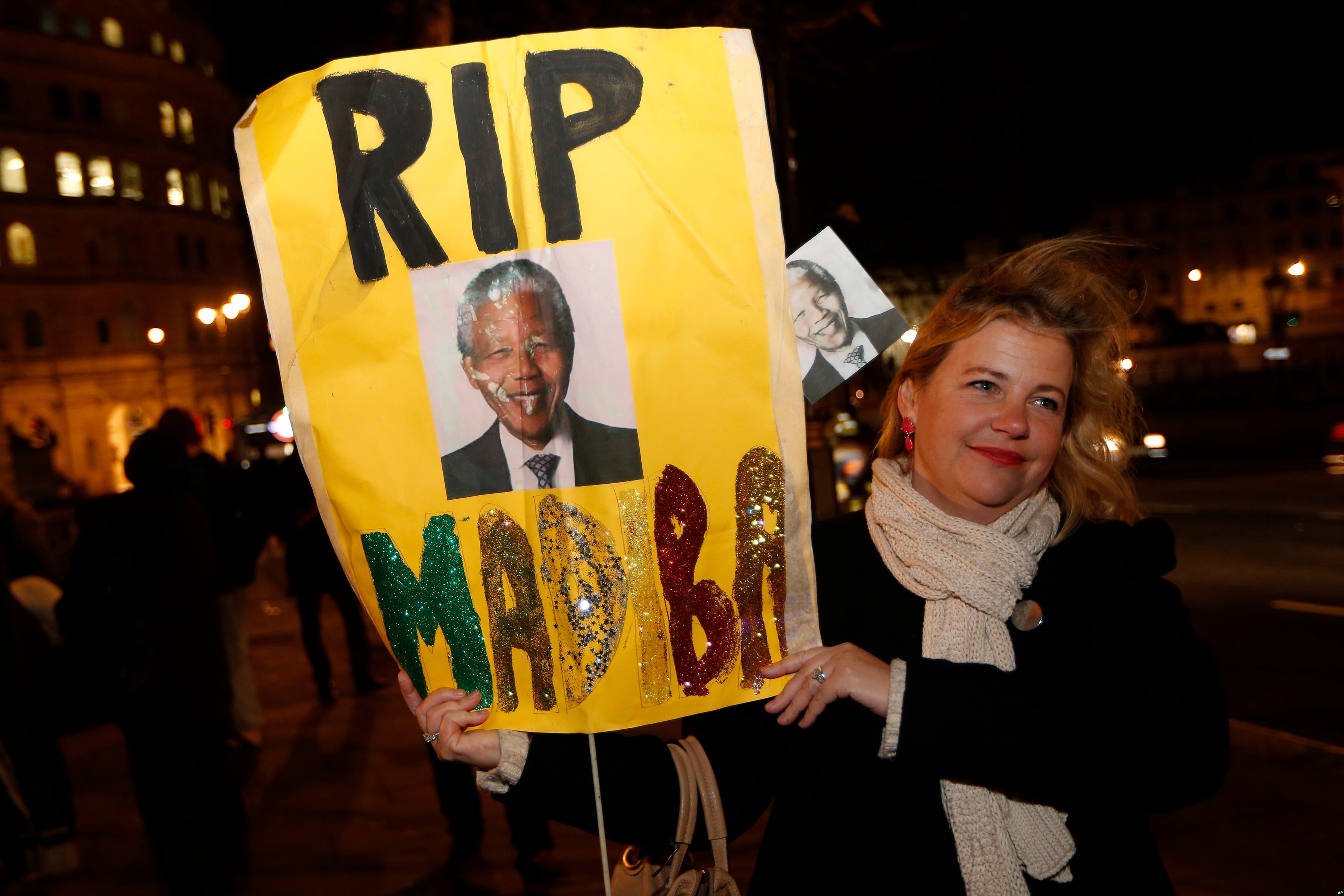 A woman with a banner pays tribute to Nelson Mandela outside the South African High Commission in London, Dec. 6, 2013.