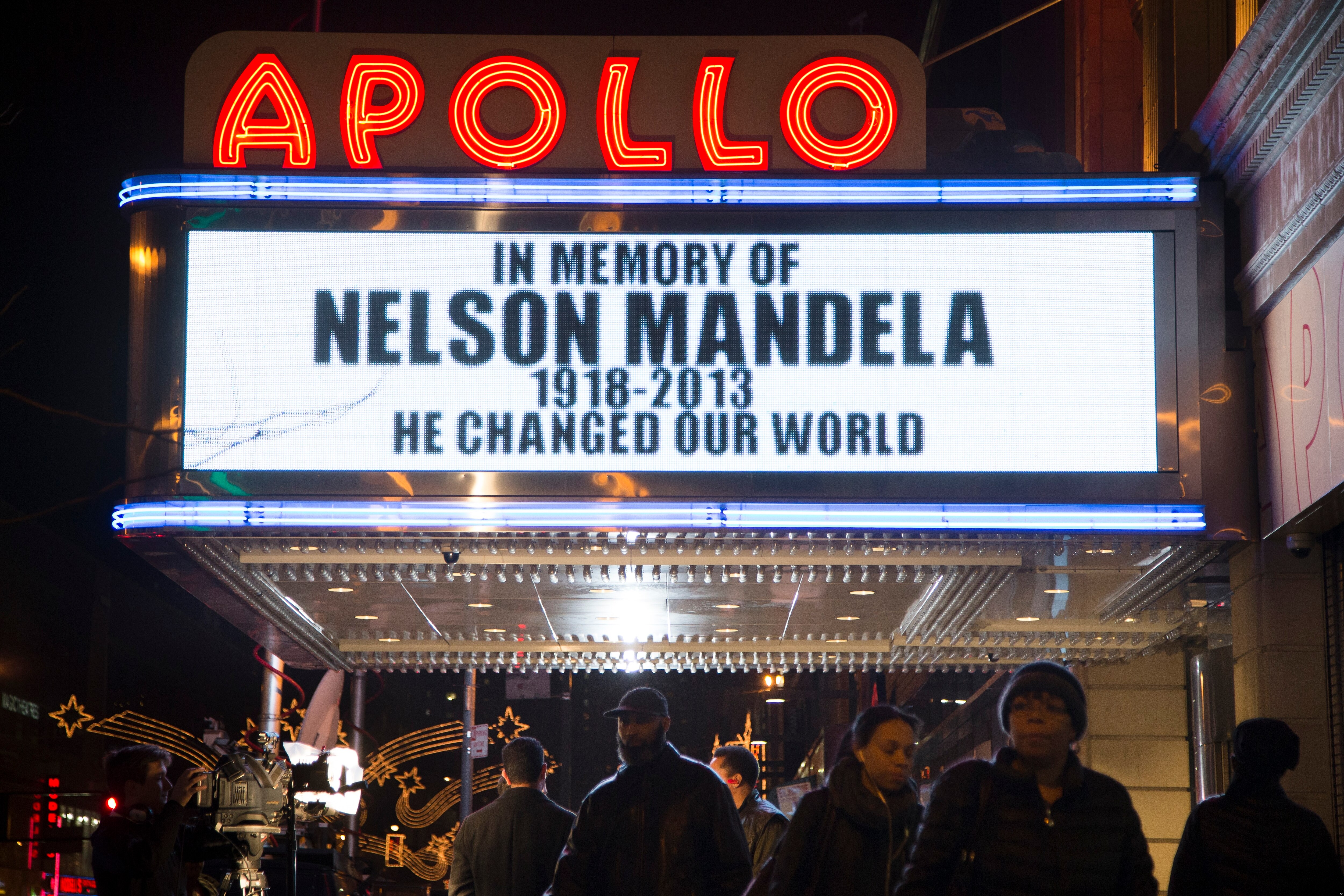 Pedestrians pass beneath the Apollo Theater marquee commemorating the life of South African leader Nelson Mandela in the Harlem neighborhood of New York, Dec. 5, 2013.
