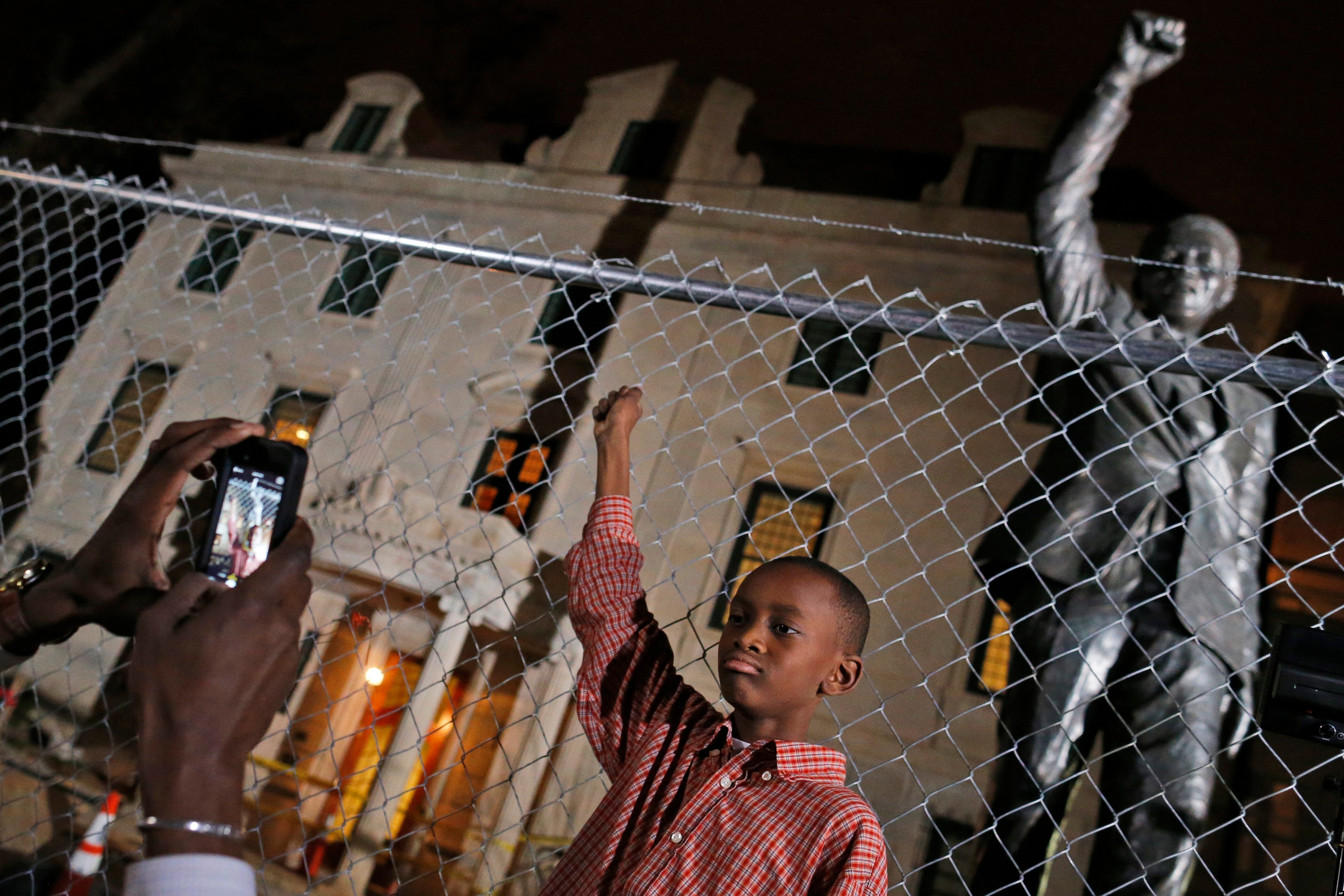 Keaton Anderson, 10, poses for a photograph for his father Dijon Anderson as they visit the statue of Nelson Mandela at the South African Embassy in Washington, Dec. 5, 2013.