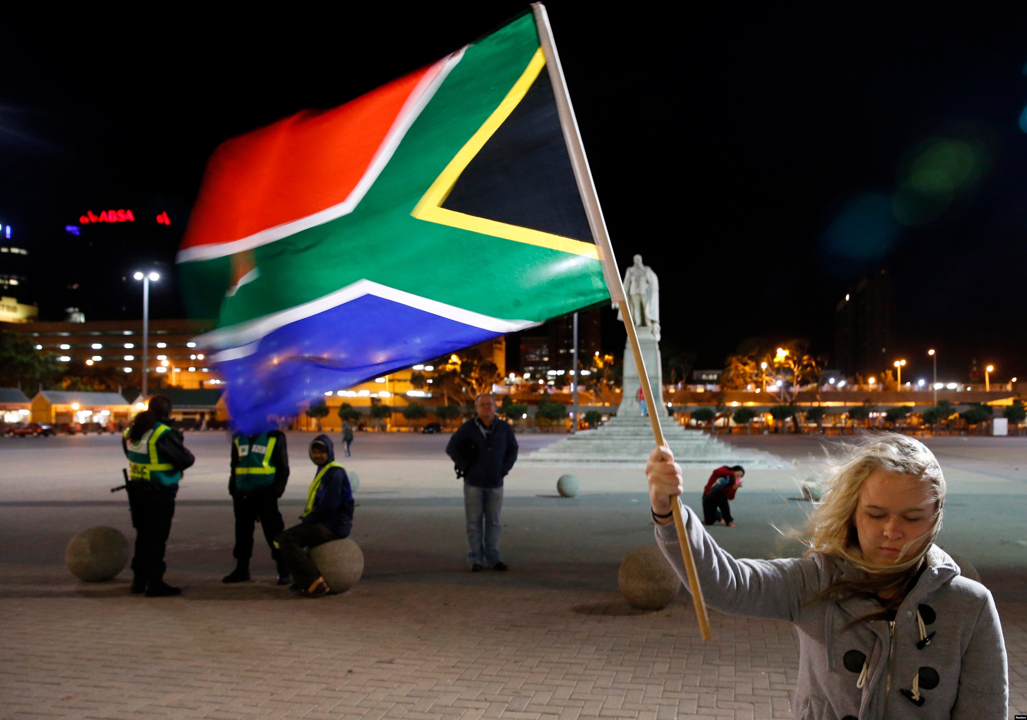 A girl holds a South African national flag as people mourn the death of Nelson Mandela outside Cape Town City Hall, Dec. 6, 2013.