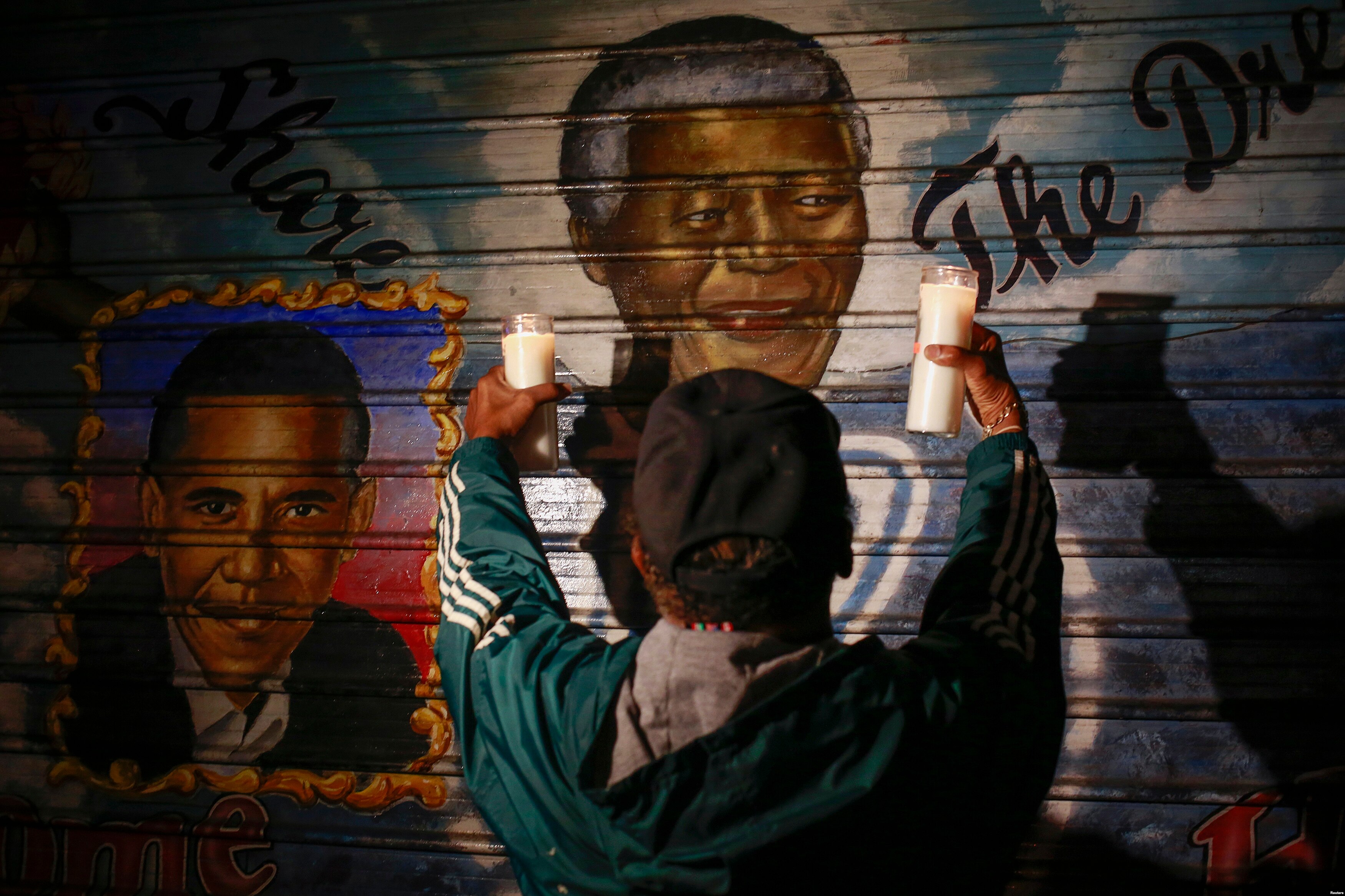 A man holds candles in front of a mural of former South African President Nelson Mandela and U.S. President Barack Obama in New York, Dec. 5, 2013.